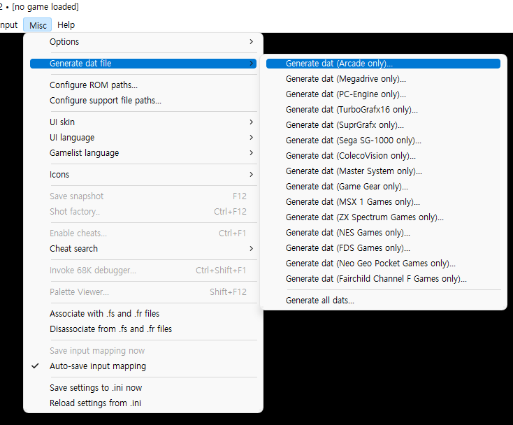 Misc > Generate dat file > Generate dat(Arcade only)... 를 눌러 dat 파일을 만든다.