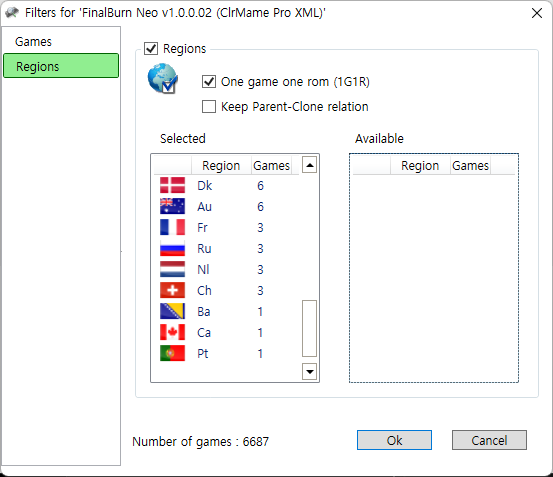 Filter settings 를 눌러 필터 지정할 창을 불러오고 Games 탭에서는 Games filtering에 체크, Clones/Samples에는 언체크한다. Regions 탭에서는 Regions에 체크, 우선순위가 될 국가 를 좌측으로 드롭다운 시켜 정리한뒤 OK를 눌러 나온다.