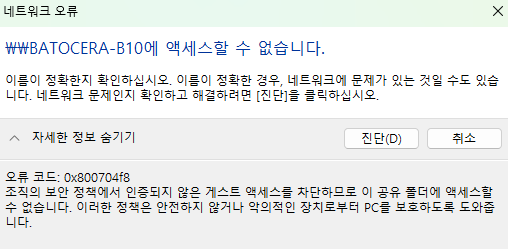 Windows 11에서 Batocera SMB 공유에 Windows 탐색기를 통한 통상 접근은 불가능하다.