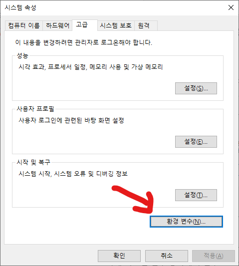 - 가장 아래의 환경 변수(N)… 를 누른다.