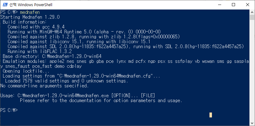 파워쉘 창을 열고 아무폴더에서 mednafen 을 실행 해본다.